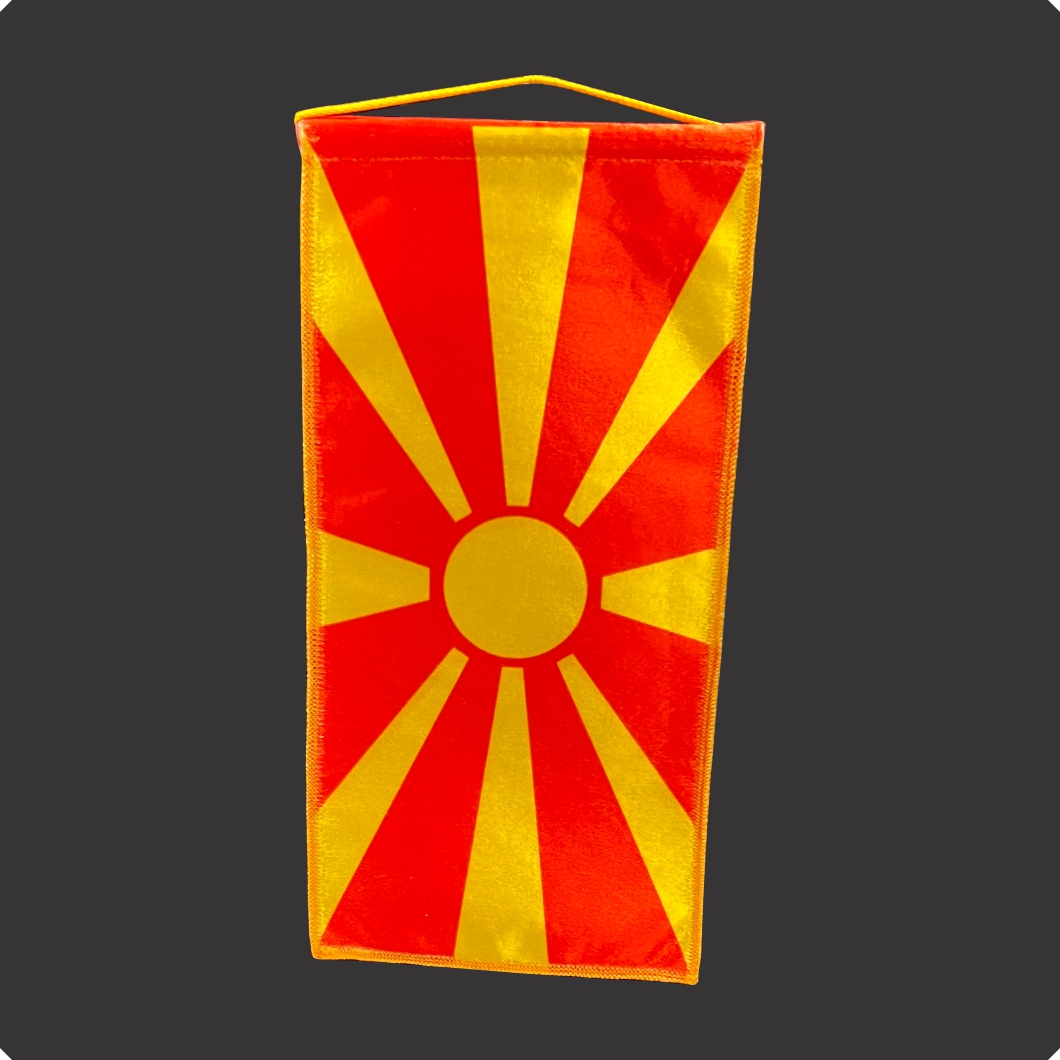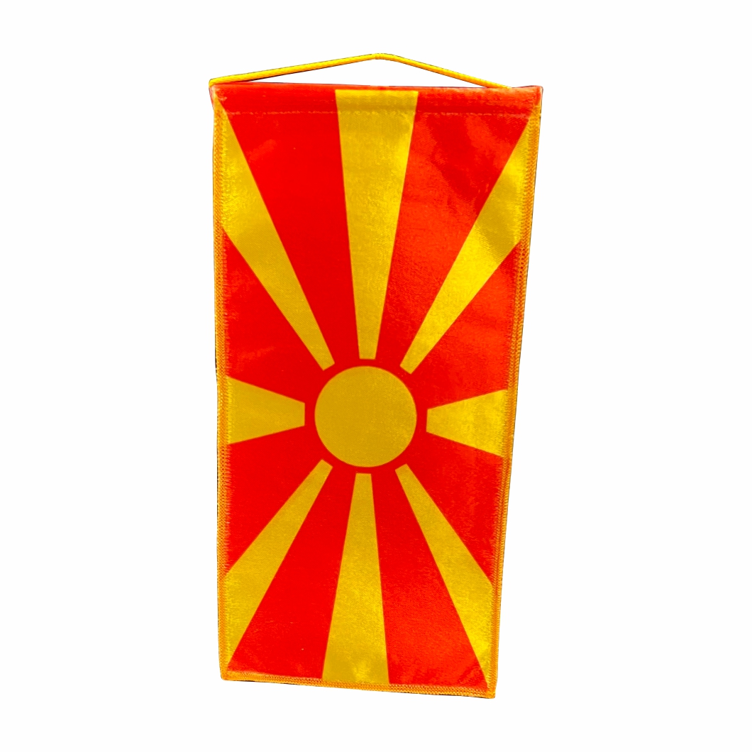 платнено знаме, сатен, 240*120мм, печатено двострано колор, обшиено оверлук, врвка, појачано со флазелин